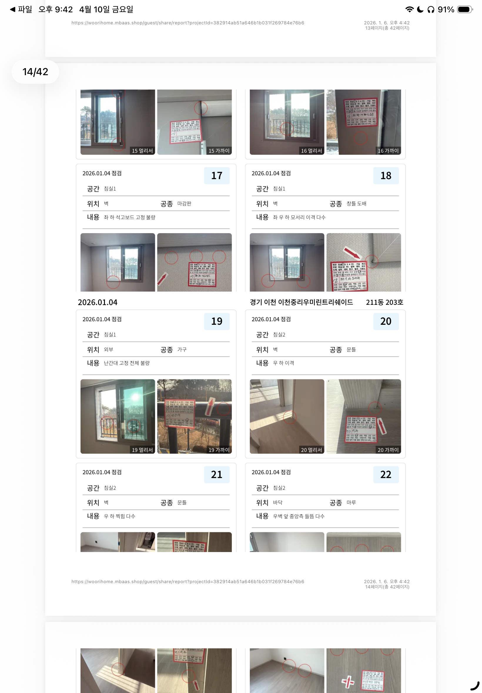 그리고 하자가 발견되면 스티커를 붙여 표시해 주고 사진을 촬영해서 아파트 전용 앱에 직접 업로드까지 해 주셨습니다.